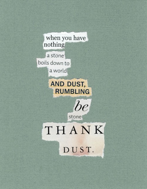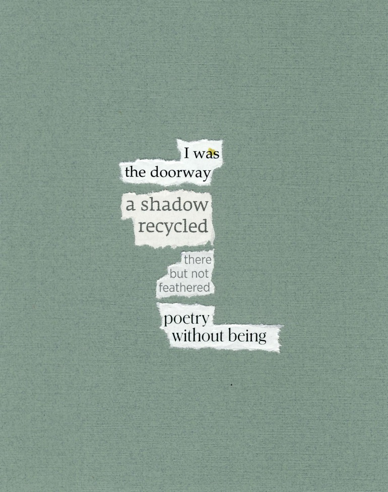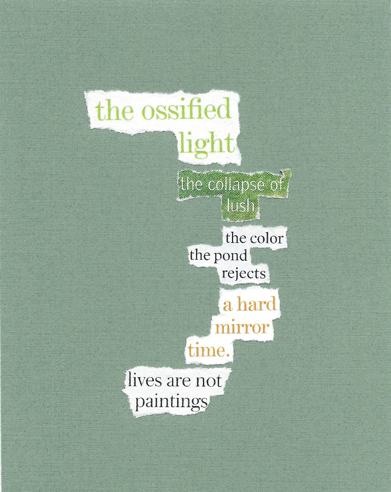 Editor’s Note: We are delighted to publish some “found poems” by J.I. Kleinberg. The poems are discovered text fragments by the artist in various media outlets (magazines, newspapers, etc) and reorganized with a new purpose. When asked about her process, J.I. Kleinberg says, ” You may have had the occasional experience of looking at a page in a book and seeing what looks like a little river of white, where the spaces between the words seem to line up and flow across the page. You know that was not intended as part of the page design, but there it is. What I do is similar, but instead of spaces, I see the accidental phrases created by words stacked on top of one another.” Read more of J.I. Kleinberg’s visual poems in our upcoming issue.