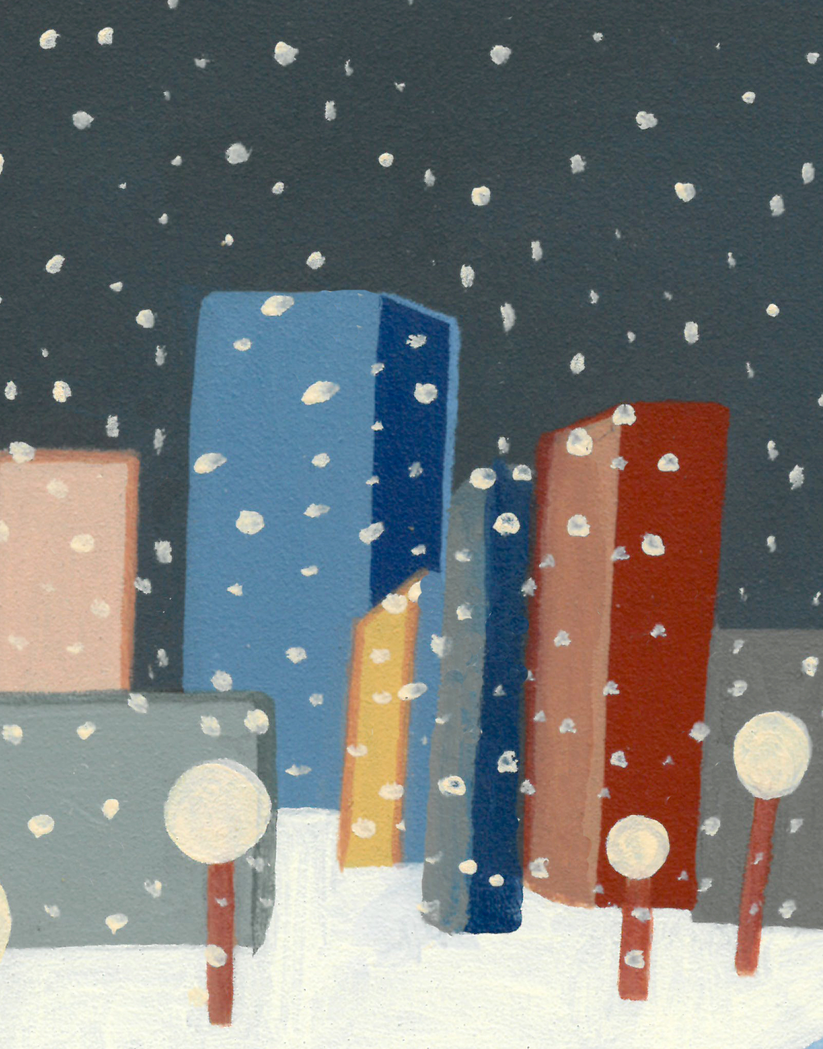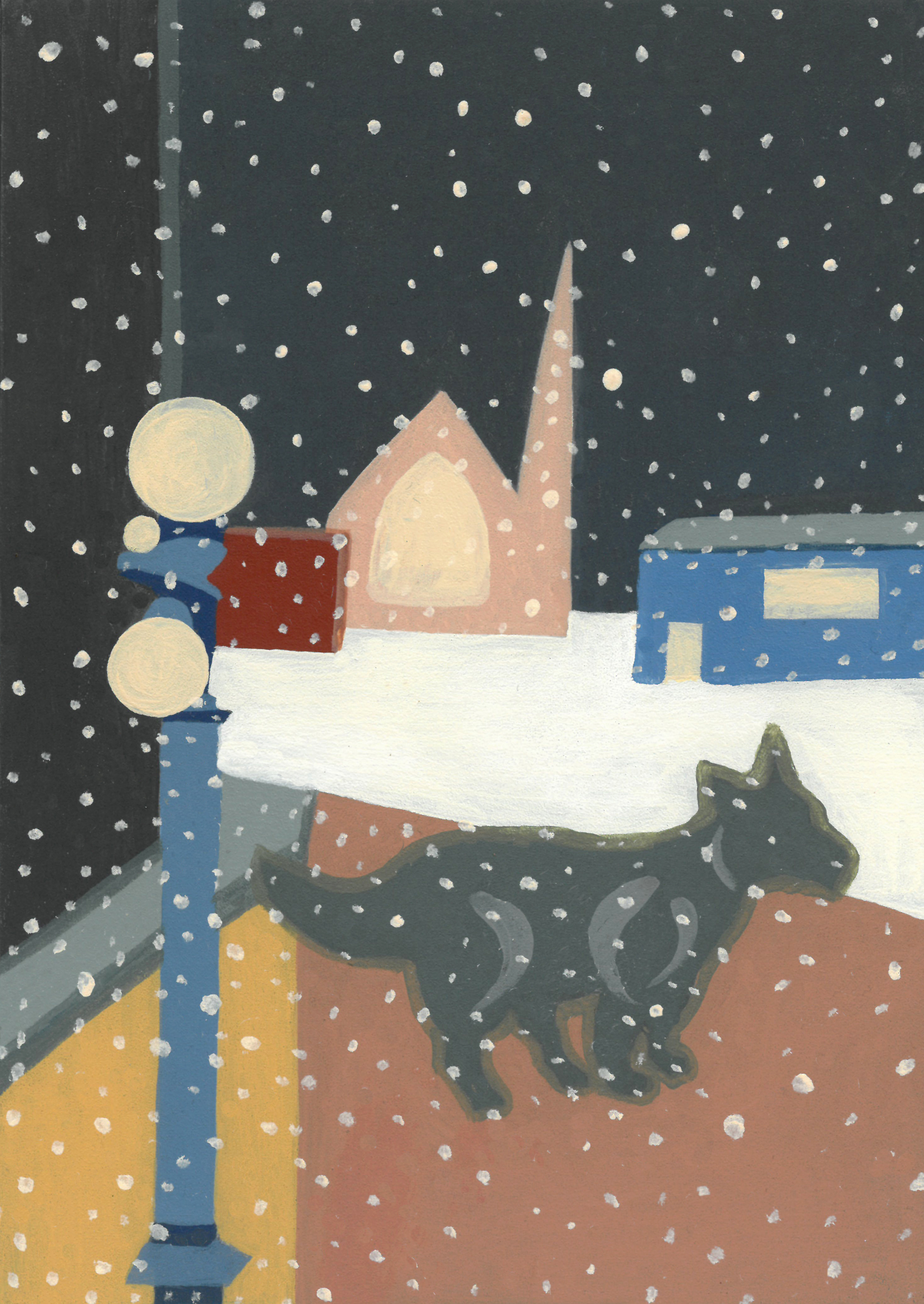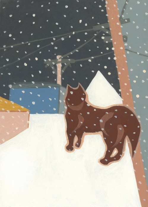 In painting the sleepscapes, these scenes that have fixed themselves in place with their snow and candy dogs, I realize there exists some relation between sleep and awake and home and away.